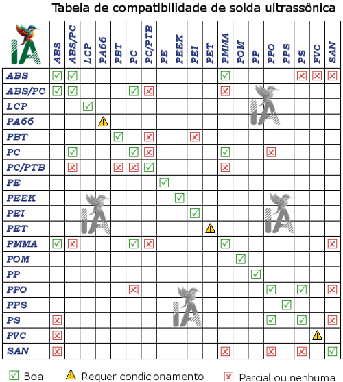 A tabela abaixo, apresenta um guia técnico e prático sobre a compatibilidade de materiais plásticos para solda por ultrassom.
