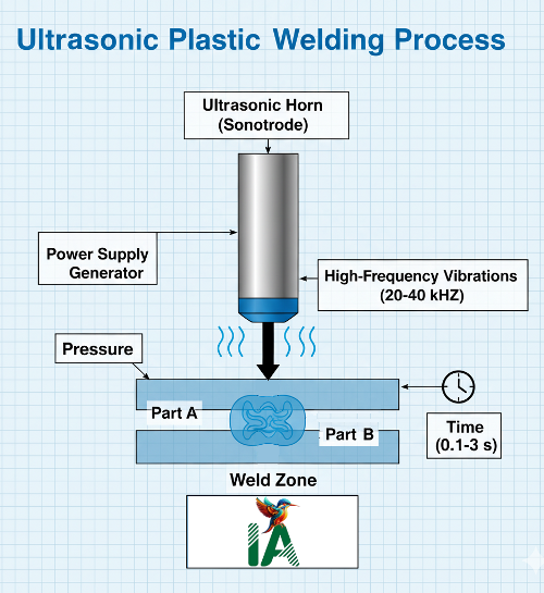 🔹 A soldagem por ultrassom de termoplásticos é um procedimento de solda plástica, em que é gerado calor por atrito mecânico no plástico através das oscilações ultrasonicas.